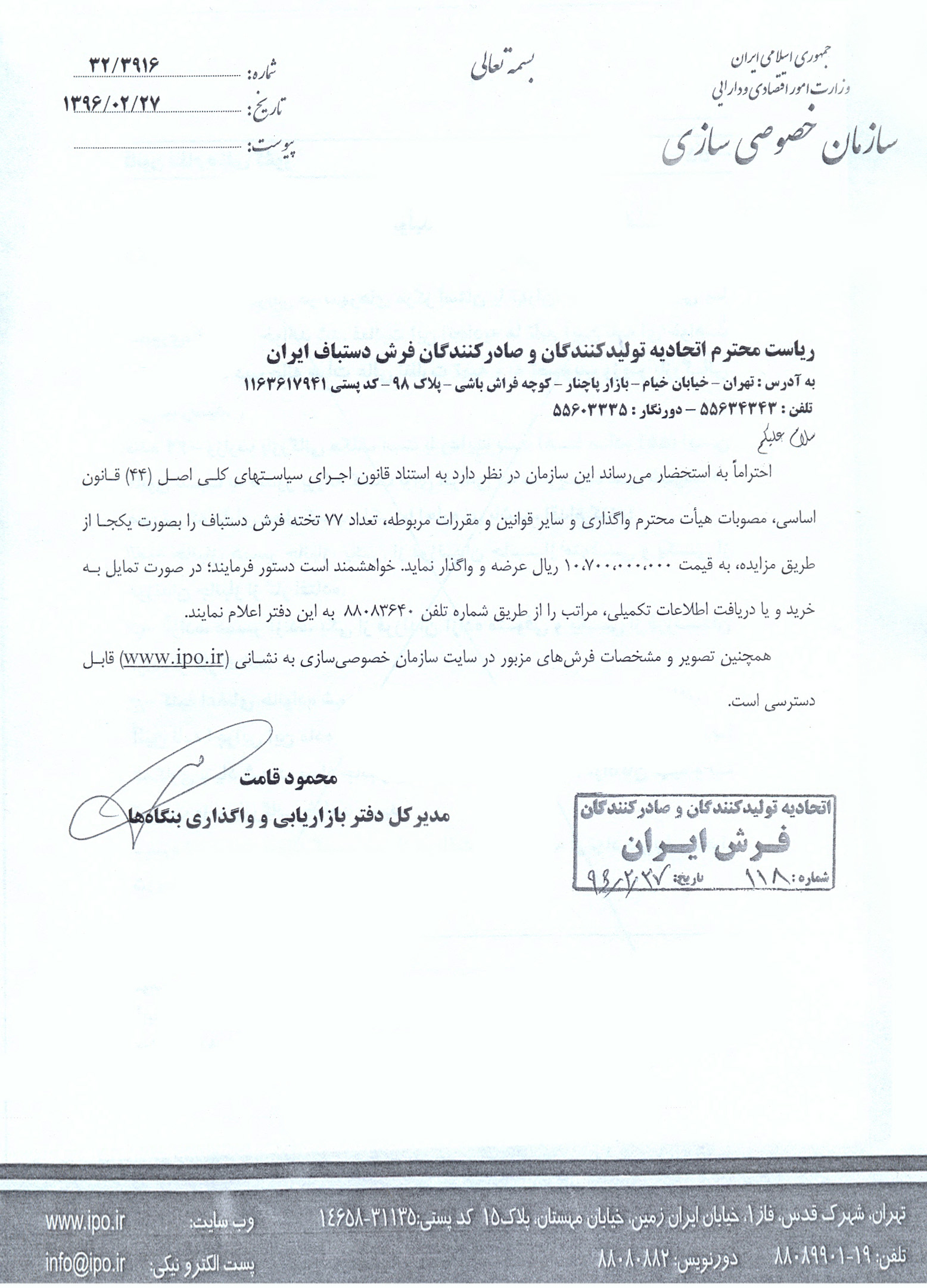 واگذاری 77 تخته فرش دستباف به صورت یکجا از طریق مزایده سازمان خصوصی سازی وزارت امور اقتصاد و دارایی