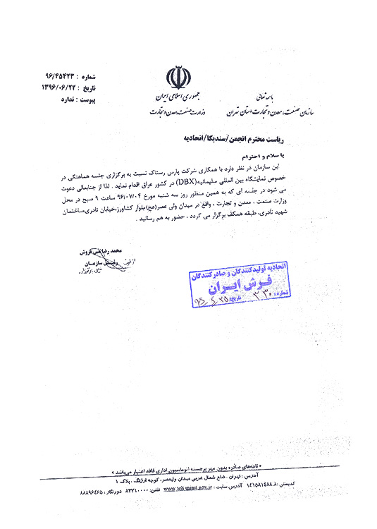 جلسه هماهنگی نمایشگاه بین المللی سلیمانیه (DBX) روز سه شنبه مورخ 96/07/04 برگزار می شود.