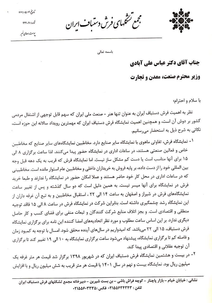 همچنین قیمت هر متر غرفه نسبت به دوره گذشته نزدیک به دو برابر و نسبت به نمایشگاه بیست و هشتم بیش از ده برابر افزایش داشته است که بسیار فراتر از میزان افزایش سطح عمومی قیمت ها از سال ۱۳۹۸ تا کنون بوده است لذا قیمت ۱۲,۶۰۰,۰۰۰ ریال به ازا هر متر مربع با توجه به خدمات قابل ارائه از نظر تشکّل های امضا کننده این بیانیه پذیرفتنی و قابل قبول نیست. در خاتمه یاد آور می شود که تشکّل های فرش در غالب ستاد عالی راهبری فرش دستباف ایران همچنان به پیگیری ها ادامه خواهند داد اما نظر به وظیفه ذاتی خود در خصوص اطلاع رسانی و شفاف سازی موضوعات، آخرین وضعیت را طی بیانیه حاضر به اطلاع اعضا می رساند و در صورت تغییر شرایط، اعم از ساعت برگزاری، قیمت یا سایر موارد، مراتب از طریق بیانیه های بعدی به اطلاع اعضای محترم تشکّل ها و خانواده بزرگ فرش دستباف ایران خواهد رسید.