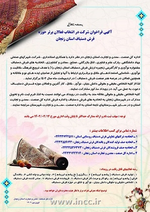 لذا به اطلاع می رساند: کلیه اشخاص حقیقی و حقوقی علاقمند به رقابت در رویداد می توانند نسبت به اخذ فرم ثبت نام و تحویل مدارک در شهرستان زنجان به اتادیه های فرش دستباف یا اداره فرش اداره کل صنعت، معدن و تجارت استاد در سایر شهرستان های تابعه استان به اداره نعت، معدن و تجارت شهرستان مراجعه نمایند.