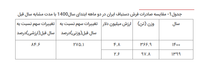 رافع بیان کرد: بر اساس آمار گمرک جمهوری اسلامی ایران و همان گونه که جدول (۲) نشان میدهد با افزایش ۲۸.۵ درصدی صادرات فرش به لحاظ ارزشی و رشد شایان توجه به میزان ۱۵۵ درصدی از نظر وزنی نسبت به مدت مشابه در سال قبل روبرو هستیم.